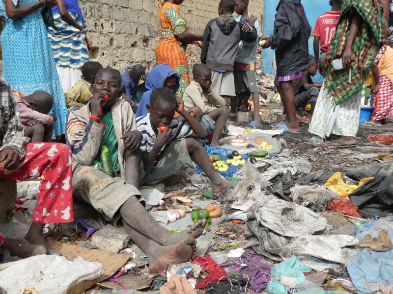 Dans ce décor sinistre, plane en permanence une odeur d’aliments en décomposition. Entassés dans un de ces couloirs sombres, des enfants talibés écoulent toutes sortes de fruits et légumes. Des marchandises données par les commerçants du coin en échange de quelques services.